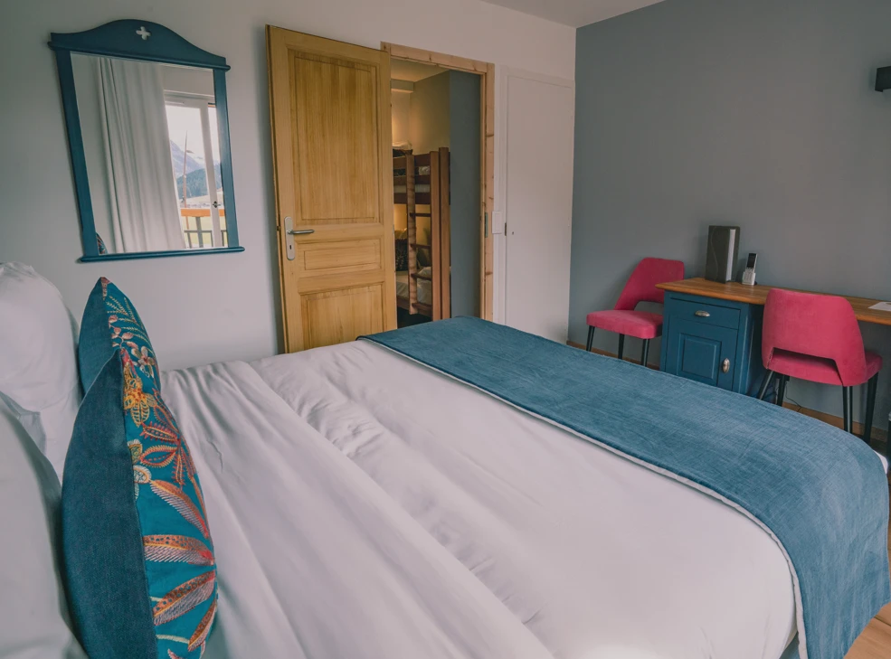 La Chambre Familiale est un véritable écrin de bois blond, contrasté par une subtile touche contemporaine qui crée un univers tout en douceur. Idéale pour les familles, elle allie raffinement et fonctionnalité avec un coin montagne comprenant un lit superposé ou une mezzanine avec deux lits supplémentaires.